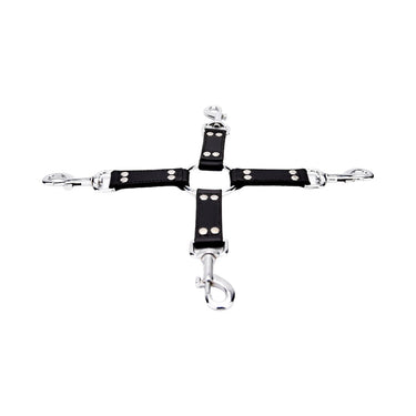 Complete your bondage scene with this incredibly versatile and extremely durable 4-way hogtie made of exquisite black leather and metal. This high quality Bound restraint will leave your sub truly tied and powerless.